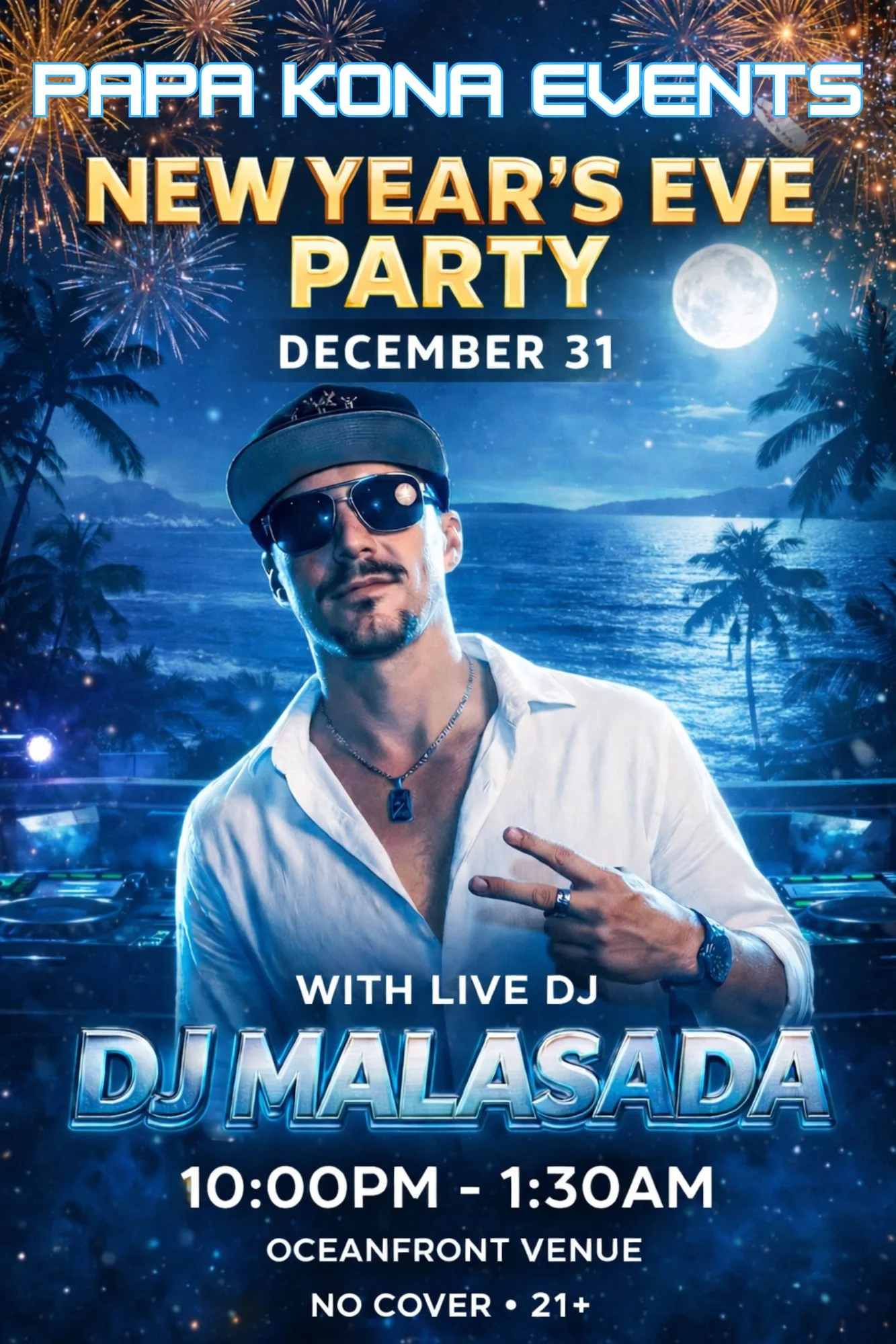 Join us for a high-energy New Year’s Eve Party with live DJ Malasada
